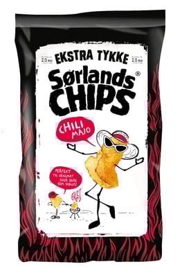 Ekstra Tykke Sørlandschips Chili Mayo, vårt hittil tykkeste potetgull med herlig smak av chili mayo. 2,0 mm tykke potetchips, en ny type sabla sprø chips som passer perfekt som tilbehør til grillmat eller bare som snacks. Sørlandschips er den originale chipsprodusenten på Sørlandet, kjent for ekstra sprø og smakfull chips. Vår potetchips stekes i peanøttolje med skallet på, i små porsjoner og på lav varme.