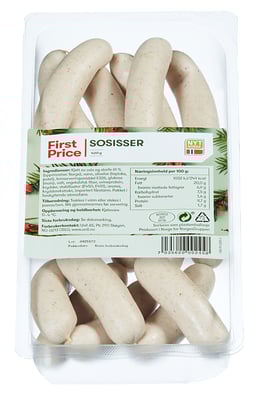 Sosisser 400g First Price fra First price Produktet er tilgjengelig hos Meny til en pris av 36.30 kr. Produktet leveres av Unil as d. Produktet ble første gang registrert 24.11.2022 og sist oppdatert 16.7.2023. Prisen har endret seg fra 49.00 kr til 36.30 kr over tid.