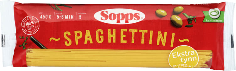 Spaghettini er laget av 100% durumhvete, en høyverdig hvetesort. Sopps har solgt pasta i Norge siden 1913, og barn og voksne har gjennom generasjoner spist gode, næringsrike og velsmakende måltid basert på sunne matvaner.