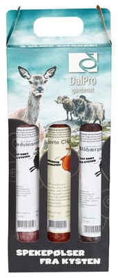 Spekepølser Fra Trønderlagskysten av Hjort og Villsau fra Dalpro As Vekten er 750 g. Produktet leveres av DALPRO AS. Produktet ble første gang registrert 11.6.2023 og sist oppdatert 6.9.2023.