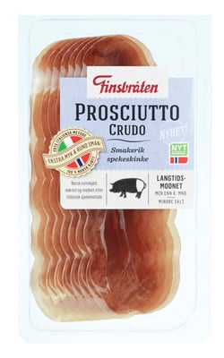 Finsbråten Prosciutto crudo, spekeskinke 80g. Italiensk smaksopplevelse med norsk kjøtt! Med kompetanse, tradisjon og utstyr fra Italia, er det norske kjøttet mørnet og modnet i Norge, etter italiensk spekemetode. Dette gir en rund, balansert og smaksrik spekeskinke med mykt og saftig bitt.