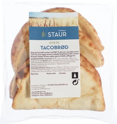 Staur Tacobrød Hvete 4x55g fra Staur Fjellbakeri Vekten er 220 g. Produktet inneholder følgende allergener: Gluten. Produktet leveres av STAUR FJELLBAKERI AS. Produktet ble første gang registrert 11.6.2023 og sist oppdatert 6.9.2023.