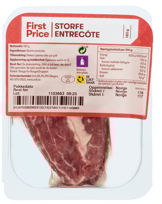 Storfe Entrecote 180g First Price fra First price er et produkt innen Kjøtt, Storfekjøtt, Entrecote. Produktet er tilgjengelig hos Joker til en pris av 59.90 kr. Vekten er 180 g. Produktet leveres av Unil. Produktet ble første gang registrert 9.1.2022 og sist oppdatert 6.10.2023. Prisen har holdt seg stabil på 59.90 kr.