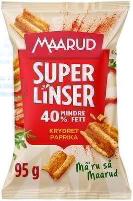 Litt sunnere snacks som smaker godt og har mye krønsj? Er det mulig? Ja, med SuperLinser får du nettopp det! I posen finner man en deilig snacks laget med ingredienser som er litt bedre for deg. Alle gode ting er tre sies det, og det samme sier vi om SuperLinser – unik sprøhet, masse smak og høy kvalitet! SuperLinser har 40% mindre fett sammenlignet med vanlig potetchips, men har like god smak. Chipsen er supersprø og bølgeformet som gir en unik krønsj. SuperLinser er dekket med super digg paprika krydder som gir ekstra god smak! Et godt og smakfullt snacksalternativ når du vil kose deg – enten om det er midt i uken eller i helgen! Eller som vi liker å si: Må’ru så Maarud!