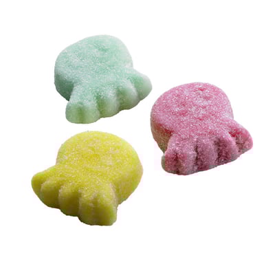 Sukker, glukose-fruktosesirup, maisstivelse, vann, surhetsregulerende middel (eplesyre E296, natriumsitrat E331), potetprotein, aromaer (sitron, pære, jordbær), fargestoffer (sort gulrotkonsentrat, E150b, E141, E100).