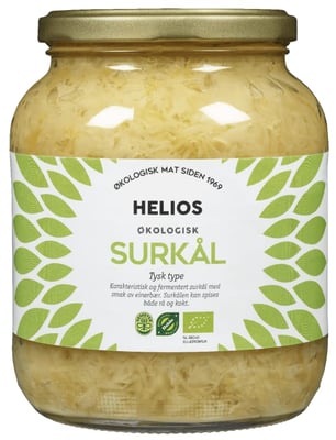 Helios Surkål er økologisk og utvikler sin karakteristiske smak og aroma gjennom en naturlig fermenteringsprosess. Økologisk kål smakssatt med litt salt og enebær. Surkålen kan spises både kald og varm. Prøv kokt surkål som topping på pølser i lompe eller brød.
