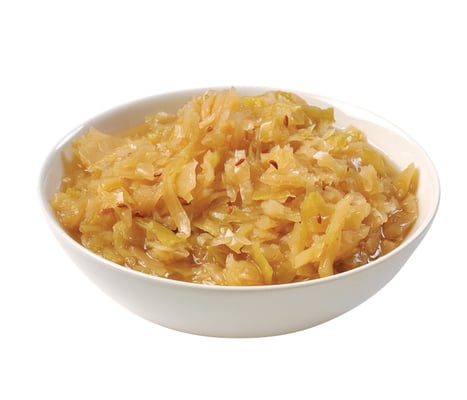 Strimlet hodekål 67 % i en lake av vann, sukker, eddik, salt, karve, krydder, konserveringsmiddel (natriumbenzoat) og fortykningsmiddel(guarnkjernemel).