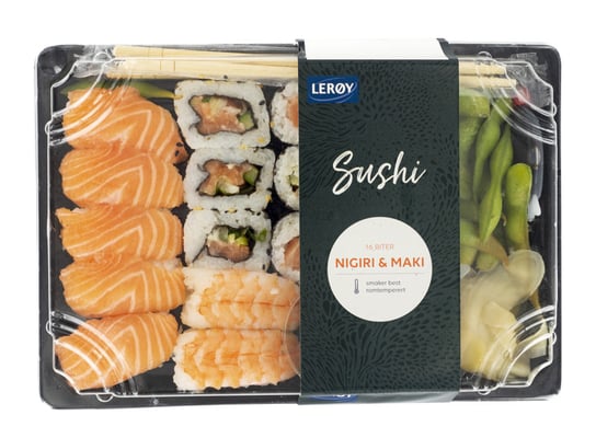 Ris (sushiris, riseddik (sukker, salt, ris, destillert alkohol, sake-lees), rapsolje, fuktighetsbevarer (fermentert ris, salt, alkohol)). LAKS (Salmo salar, oppdrettet i Norge). Edamame ( SOYA *1). SCAMPI (Litopenaeus vannamei, oppdrettet i Vietnam). Syltet ingefær (ingefær, vann, salt, surhetsregulerende middel: E260, E330, konserveringsmiddel: E202, søtstoff: E955, E954, E960a). Soyasaus (vann, SOYA, HVETE, salt, smaksforsterker: E621, E635, alkohol, søtstoff: E960a (dekstrin), E954). Agurk. Purre*1. Mango. Chilimajones (rapsolje, soyasaus (SOYA, salt, eddiksprit), EGG, sambal oelek (chilipasta, salt, surhetsregulerende middel: E260, konserveringsmiddel: E211), eddik, sukker, hydrolysert protein (SOYA), salt, cayennepepper, pepper, stabilisator: E412, E415, surhetsregulerende middel: E330, aroma, antioksidant: E385, konserveringsmiddel: E202). Wasabi (søtstoff: E420, wasabi, pepperrot (SULFITT), HAVRE (glutenfri), rapsolje, salt, krydder (SENNEP, gurkemeie), antioksidant: E300, surhetsregulerende middel: E330, maisstivelse, fargestoff: E133). Wasabimajones (rapsolje, EGG, eddik, wasabi (pepperrot, SENNEP, wasabi), sukker, pepperrot (pepperrot, rapsolje, salt, konserveringsmiddel: E223 (SULFITT), fortykningsmiddel: E401), salt, stabilisator: E412, E415, surhetsregulerende middel: E330, aroma, antioksidant: E385, konserveringsmiddel: E202). SESAM. Nori*2. Kan inneholde BLØTDYR.