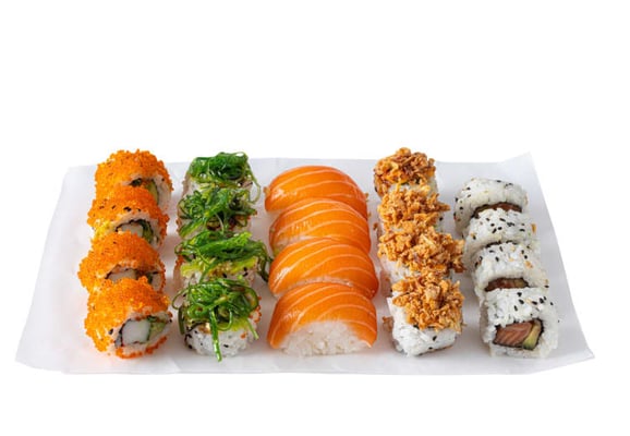 Tilberedt ris (ris, sukker, alkoholeddik, riseddik, salt, sukkerrørmelasse), laks (fisk), avokado, agurk, wakame (tang (undaria pinnatifida) 78%, fortykningsmiddel e406 (agar-agar), eikesteinsopp, sukker, chili, sesam (3%), fruktose, salt, marinade (sesamolje, soyasaus (soya, hvete (gluten), salt), riseddik, vann, fargestoffer (e102, e133). stekt løk (løk (58%), vegetabilske oljer, maisstivelse), noritang (tørket tang (100%)), masago (lodderogn (mallotus villosus) (fisk) 88 %, sukker, salt, mirin (søt sake), soyasaus (vann, soya, hvete (gluten), salt), eddik, fargestoffer e110 og e 129). majones (rapsolje, vann, eggeplomme, sukker, eddik, sennepsfrø, stabilisatorer (guargummi, xantangummi), salt, surhetsregulator (eple- og sitronsyre), konserveringsmidler (kaliumsorbat, natriumbenzoat), fargestoffer (karotener), naturlig aroma, cayennepepper), ålesaus (soyasaus (soya, hvete (gluten), salt), sukker, vann, krydder av gjæret ris, modifisert stivelse, fargestoff e150a, søt risvin, gjærekstrakt), srirachasaus (chili 61%, sukker, vann, salt, hvitløk, smaksforsterkere (e621), stabilisator (e415), e260, e330, konserveringsmidler (e202))) og sesam.