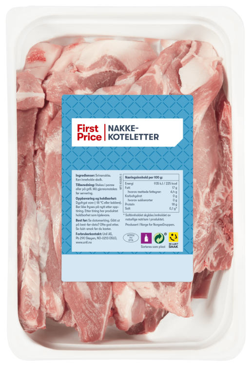 Svin Nakkekotelett Ca1kg First Price fra First price er et produkt innen Kjøtt, Svinekjøtt, Svinekoteletter. Produktet er tilgjengelig hos Joker til en pris av 109.00 kr. Produktet leveres av Unil. Produktet ble første gang registrert 11.6.2023 og sist oppdatert 9.4.2026. Prisen har holdt seg stabil på 109.00 kr.