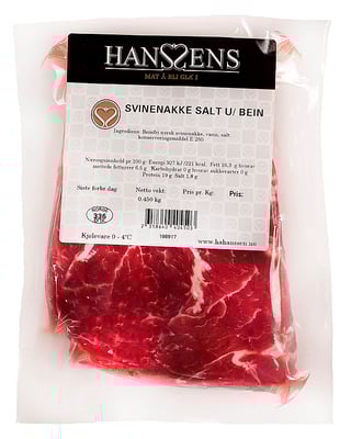 Svinenakke Salt u.Ben i stk Hanssens fra Hanssens Vekten er 0.5 kg. Produktet leveres av H A HANSSEN A/S. Produktet ble første gang registrert 11.6.2023 og sist oppdatert 6.9.2023.