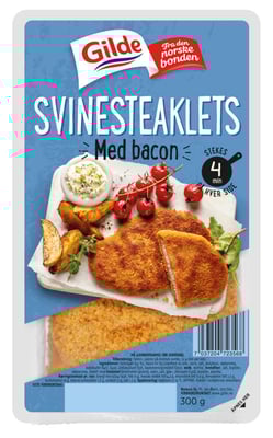 Svinesteaklets m/Bacon 300g Gilde fra Gilde er et produkt innen Middag, Ferdigmåltider, Panert kjøtt. Produktet er tilgjengelig hos SPAR til en pris av 57.90 kr. Vekten er 300 g. Produktet inneholder følgende allergener: Gluten, Melk. Produktet leveres av Nortura sa g. Produktet ble første gang registrert 9.1.2022 og sist oppdatert 6.10.2023. Prisen har holdt seg stabil på 57.90 kr.
