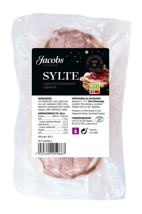 Sylte Bit 460g Jacobs Utvalgte fra Jacobs utvalgte er et produkt innen Pålegg & frokost, Kjøttpålegg, Sylte. Produktet koster 139.30 kr. Produktet leveres av Unil as. Produktet ble første gang registrert 8.3.2026 og sist oppdatert 14.3.2026.