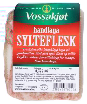 Sylteflesk 400g Vossakjøt fra Vossakjøt er et produkt innen Pålegg & frokost, Kjøttpålegg, Sylte. Vekten er 0.4 kg. Produktet leveres av SPESIALGROSSISTEN AS. Produktet ble første gang registrert 11.6.2023 og sist oppdatert 6.9.2023.