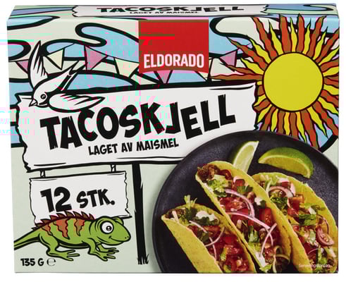 Tacoskjell 12stk 135g Eldorado fra Eldorado Produktet er tilgjengelig hos SPAR til en pris av 18.90 kr. Produktet leveres av Unil as d. Produktet ble første gang registrert 9.1.2022 og sist oppdatert 16.7.2023. Prisen har holdt seg stabil på 18.90 kr.