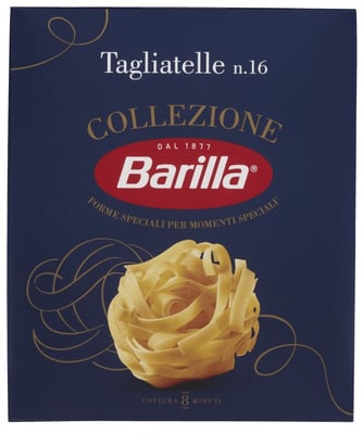 Tagliatelle pasta fra Barilla er en ekte italiensk båndpasta i nøster, bronsestøpt og av høyeste kvalitet. Legenden forteller at tagliatelle er inspirert av hårmanken til Lucrezia Borgia. En poetisk og dyktig kokk ved hoffet dedikerte denne pastaen til henne under bryllupet med Alfonso d'Este: ingen pastafasong kan skilte med en mer romantisk opprinnelse. Barilla viderefører denne tradisjonen ved å gi deg Collezione Tagliatelle, tilberedt av perfekt utkjevlet deig, passe ru og porøs til å holde på sausen og fremheve en hvilken som helst smak. Dette er uten tvil en italiensk favoritt, som alle vil elske!