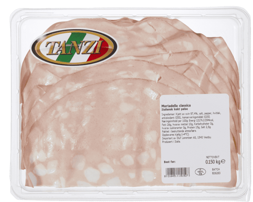 Tanzi Mortadella Classica 150g fra TANZI er et produkt innen Pålegg & frokost, Kjøttpålegg, Kjøttpålegg. Produktet er tilgjengelig hos Coop til en pris av 132.90 kr. Produktet leveres av OLUF LORENTZEN AS. Produktet ble første gang registrert 9.1.2022 og sist oppdatert 16.7.2023. Prisen har holdt seg stabil på 132.90 kr.
