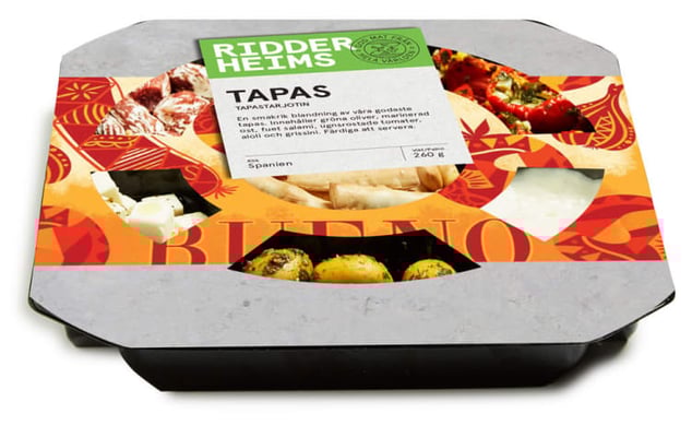 Grønne oliven 25%: (grønne oliven 87%, rapsolje, krydder og urtekrydder, olivenolje, hvitløk, salt, balsamico, løk, antioksidant: askorbinsyre e300, konserveringsmiddel: sorbinsyre e200, natriumbenzoat e211, fargestoff: karamell (ammoniakk-sulfittprosess) e150d.) marinert ost 15%: (ost 57% (pasteurisert kumelk, salt, syrekultur, vegetabilsk løpe), rapsolje, olivenolje, sjalottløk, krydder og urtekrydder, antioksidant: askorbinsyre e300, konserveringsmiddel: sorbinsyre e200, natriumbenzoat e211.) fuet salami 17%: (svinekjøtt, svinefett, salt, krydder, laktose, druesukker, antioksidant: natriumaskorbat e301, konserveringsmiddel: natriumnitritt e250, kaliumnitrat e252, fargestoff: karminer e120. till 100g ferdig produkt er anvendt: 122g kjøttråvare.) ristede tomater 17%: (tomat 72%, rapsolje, krydder og urtekrydder, hvitløk, olivolje, salt, hvitvinseddik, antioksidant: askorbinsyre e300, konserveringsmiddel sorbinsyre e200, natriumbenzoat e211.) aioli 19%: (rapsolje, vann, hvitløk 5%, olivenolje, eggeplomme, salt, sukker, eddik, sennepsfrø, surhetsregulerende middel: sitronsyre e330, konserveringsmiddel: sorbinsyre e200, natriumbenzoat e211. maltodekstrin, stabilisator: guarkjernemel e412), aroma.) brødpinner 7%: (hvetemel, olivenolje, salt, gjær, maltet hvete, antioksidant: rosmarinekstrakt e392.)