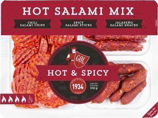 spicy salami sticks: grisekød/griskött, grisefedt/grisfett, geleringsmiddel/geleringsmedel (e401), salt, krydderier/kryddor (sød/söt paprika, peber/peppar, chilipeber/chilipeppar) glukose/glukos, gærekstrakt/jästextrakt, antioxidant/antioxidationsmedel (e316),aromaer/aromer, paprikaekstrakt/paprikaextrakt, krydderiekstrakter/krydderextrakt, stabilisator/stabiliseringsmedel (e509), farge/färgämne (e120), konserveringsmiddel/konserveringsmedel (e250), starterkultur/startkultur.