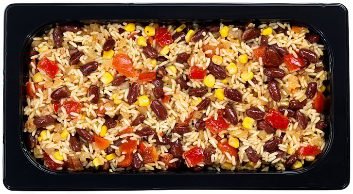 Ris (34,5 %), røde bønner, løk, paprika, mais, rapsolje, sukker, eddik, havsalt, limejuice, marinade (rapsolje, salt, krydder, aroma, fullherdet rapsfett, guarkjernemel, maltodextrin), herdet rapsfett, sukker, gjærekstrakt.
