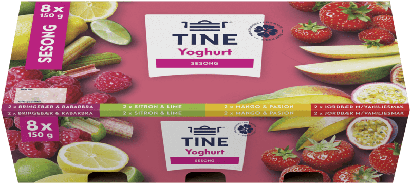 TINE Yoghurt Mango & Pasjonsfrukt: helmelk, 5 % sukker, skummetmelkpulver, 2 % mangopure, 2 % pasjonsfrukt fra konsentrat, aromaer, yoghurtkultur (Streptococcus thermophilus og Lactobacillus bulgaricus) TINE Yoghurt Jordbær Lime: Helmelk, 5 % sukker, 4 % jordbær, skummetmelkpulver, 2 % limejuice*, 1 % solbærjuice*, aronia*, aromaer, yoghurtkultur (Streptococcus thermophilus og Lactobacillus bulgaricus) *Fra konsentrat TINE Yoghurt Bærmiks: Helmelk, 5 % sukker, 2 % jordbær, 2 % blåbær, skummetmelkpulver, aromaer, yoghurtkultur (Streptococcus thermophilus og Lactobacillus bulgaricus) TINE Yoghurt Fersken Sesong L1 22: helmelk, 5 % sukker, 5 % fersken og ferskenpuré*, skummetmelkpulver, gulrotjuice*, sitronjuice*, aromaer, yoghurtkultur (Streptococcus thermophilus og Lactobacillus bulgaricus) *Fra konsentrat