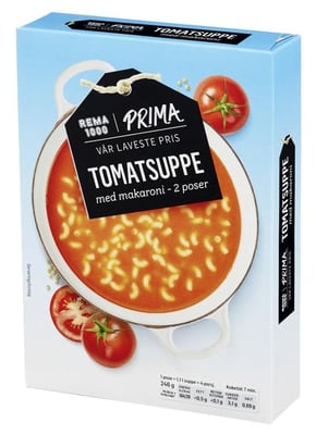 Tomatsuppe Med Makaroni 2pk, 246 g fra REMA 1000 Produktet er tilgjengelig hos Oda til en pris av 24.00 kr. Vekten er 2 piece. Produktet leveres av Rema 1000. Produktet ble første gang registrert 9.1.2022 og sist oppdatert 14.3.2026. Prisen har endret seg fra 22.50 kr til 24.00 kr over tid.