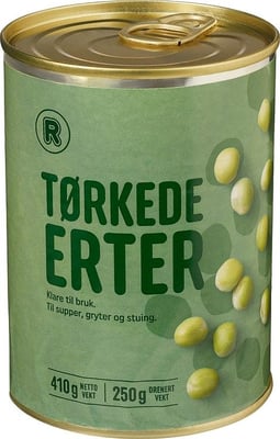 Tørkede Erter 410 g fra REMA 1000 Produktet er tilgjengelig hos Oda til en pris av 14.90 kr. Vekten er 410 g. Produktet leveres av Rema 1000. Produktet ble første gang registrert 9.1.2022 og sist oppdatert 14.3.2026. Prisen har endret seg fra 9.30 kr til 14.90 kr over tid.