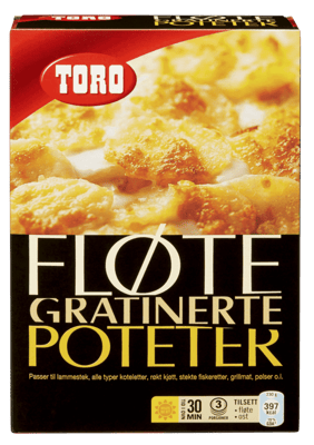 Toro Fløtegratinerte Poteter 104g fra TORO er et produkt innen Middag, Potetretter, Gratinerte poteter. Produktet er tilgjengelig hos Coop til en pris av 54.90 kr. Produktet inneholder følgende allergener: Melk. Produktet leveres av ORKLA FOODS NORGE AS (STABBURET). Produktet ble første gang registrert 9.1.2022 og sist oppdatert 16.7.2023. Prisen har holdt seg stabil på 54.90 kr.