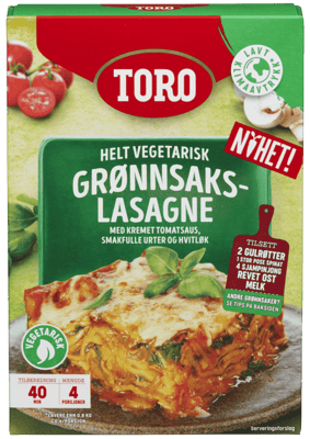 Toro Grønnsakslasagne 203g fra TORO Produktet er tilgjengelig hos Coop til en pris av 47.90 kr. Produktet inneholder følgende allergener: Gluten, Melk. Produktet leveres av ORKLA FOODS NORGE AS (STABBURET). Produktet ble første gang registrert 9.1.2022 og sist oppdatert 16.7.2023. Prisen har holdt seg stabil på 47.90 kr.