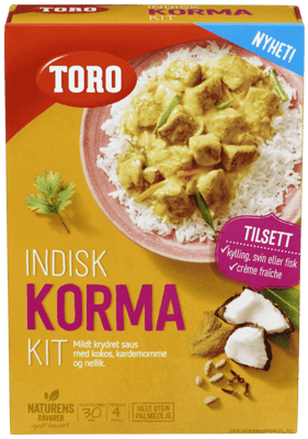 Toro Indisk Korma kit 291g fra TORO Produktet er tilgjengelig hos Coop til en pris av 87.90 kr. Produktet leveres av ORKLA FOODS NORGE AS (STABBURET). Produktet ble første gang registrert 9.1.2022 og sist oppdatert 16.7.2023. Prisen har holdt seg stabil på 87.90 kr.