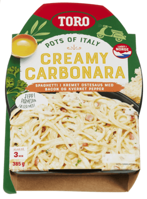 Toro Spagetti Carbonara 385g fra TORO Produktet er tilgjengelig hos Coop til en pris av 76.90 kr. Produktet inneholder følgende allergener: Egg, Gluten, Melk. Produktet leveres av ORKLA FOODS NORGE AS (STABBURET). Produktet ble første gang registrert 9.1.2022 og sist oppdatert 16.7.2023. Prisen har holdt seg stabil på 76.90 kr.