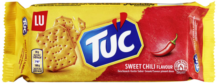 TUC er tynne, sprø ovnsbakte kjeks med smak av søt chili. Gode å spise akkurat som de er, som snacks eller til ostefatet. Perfekt størrelse å ta med i veska eller på piknik.
