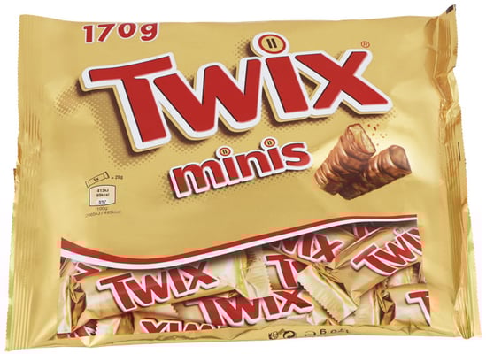 Twix Minis 170g Vekten er 0.17 kg. Produktet inneholder følgende allergener: Gluten, Melk, Soya. Produktet leveres av MARS NORGE AS. Produktet ble første gang registrert 11.6.2023 og sist oppdatert 6.9.2023.