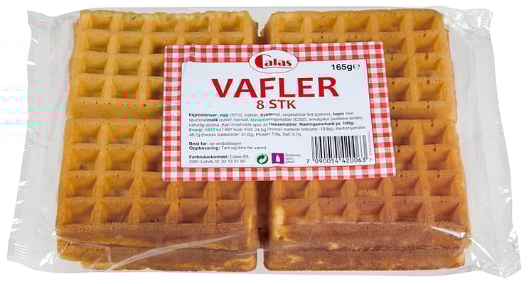Vafler 8stk 165g Vekten er 0.17 kg. Produktet inneholder følgende allergener: Egg, Gluten, Lupiner, Melk. Produktet leveres av CALAS AS. Produktet ble første gang registrert 11.6.2023 og sist oppdatert 6.9.2023.