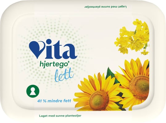 Vita hjertego’ Lettmargarin er en margarin for de som ønsker et mer hjertevennlig og kaloriredusert alternativ til brødskiva. Den er laget med raps- og solsikkeolje og inneholder 30 prosent mindre fett enn Vita hjertego’ Margarin.