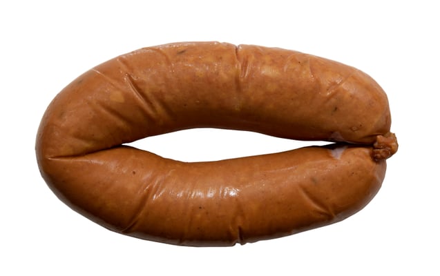 Ingredienser:Får, storfe og svinekjøtt (67,2%), vann, potetmel, tørr MELK, salt, glucose sirup, antioksidant (E-301), pepper, ingefær, karve, konserveringsmiddel (E-250) #Næringsinnhold pr.100 gram ferdig vare: Energi:1020kJ /246 kcal, Fett:19,5 g, hvorav mettede fettsyrer:4,3 g, Karbohydrater:6,1 g, hvorav sukkerarter:0,2 g, Protein:11,4 g, Salt:1,7 g