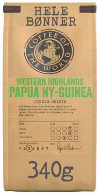 Kaffebønnene fra Western Highlands i Papua Ny-Guinea har en sødmefull aroma og en fruktig smak av plomme, rosin og søt tobakk. Fakta om Western Highlands Papua Ny-Guinea: Aroma (1-5): 4 Body (1-5): 4 Syrlighet (1-5): 3 Region: Western Highlands Meter over havet: 1600 Bønnetype: Typica. catimor. caturra Kvalitet: A Brenningsgrad (1-7): 3 Prosessmetode: Vasket Innhøstingsperiode: April-september Vi samarbeider med Miljøfyrtårn og Grønt Punkt Norge for å tilby norske forbrukere miljøvennlig kaffe. www.coffeeoftheworld.no
