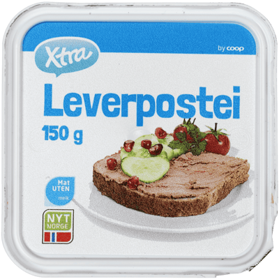 X-tra Leverpostei 150g fra X-TRA Produktet er tilgjengelig hos Coop til en pris av 13.10 kr. Produktet leveres av NORTURA SA (GILDE). Produktet ble første gang registrert 9.1.2022 og sist oppdatert 16.7.2023. Prisen har endret seg fra 10.50 kr til 13.10 kr over tid.