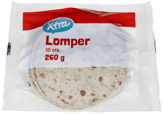 X-tra Lomper 10pk 260g fra x-tra Produktet er tilgjengelig hos Coop til en pris av 6.90 kr. Produktet inneholder følgende allergener: Gluten, Sulfitt. Produktet leveres av BAXT AS. Produktet ble første gang registrert 9.1.2022 og sist oppdatert 16.7.2023. Prisen har endret seg fra 6.30 kr til 6.90 kr over tid.