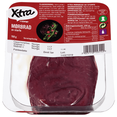X-tra Skivet Mørbrad Storfe 150g fra X-TRA Produktet er tilgjengelig hos Coop til en pris av 46.90 kr. Produktet leveres av FATLAND SALG AS. Produktet ble første gang registrert 9.1.2022 og sist oppdatert 16.7.2023. Prisen har endret seg fra 44.40 kr til 46.90 kr over tid.