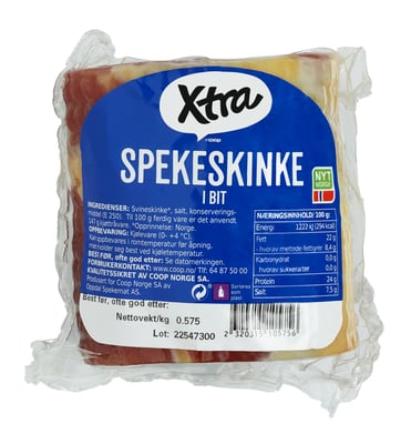 X-tra Spekeskinke Bit 500g Vv fra X-tra Vekten er 0.5 kg. Produktet leveres av FATLAND SALG AS (COOP-PRODUKTER). Produktet ble første gang registrert 11.6.2023 og sist oppdatert 6.9.2023.