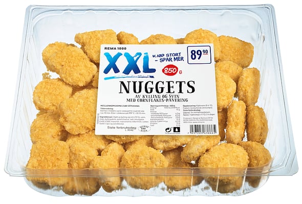 Xxl Nuggets Kylling/svin 850g fra Rema Vekten er 850 g. Produktet leveres av NORTURA SA (GILDE). Produktet ble første gang registrert 11.6.2023 og sist oppdatert 6.9.2023.