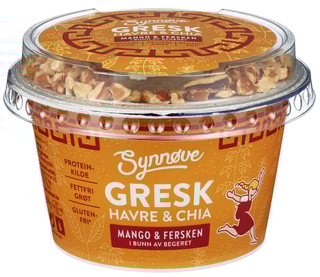 Synnøve Gresk Havre & Chia er perfekt for de som ønsker et fullverdig måltid på farten. Produktet er laget på Synnøve Gresk naturell, tilsatt havre & chiafrø. Med frisk mango & fersken puré i bunn og pekannøtter på toppen, er dette et komplett, mettende o