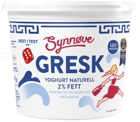 Synnøve helt ekte Gresk Yoghurt er selvsagt laget i Hellas. Yoghurten har en fyldig konsistens, inneholder lite fett og er rik på proteiner.