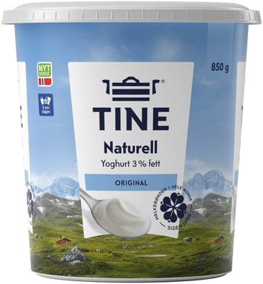 TINE® Yoghurt Naturell er helmelk syrnet med yoghurtkultur. Pasteurisert og homogenisert før syrning. Smaken skal være mild, syrlig og aromatisk. TINE® Yoghurt Naturell er den opprinnelige TINE®-yoghurten. Den har en fyldig konsistens, en mild og syrlig aromatisk smak og inneholder 3,4 % fett.