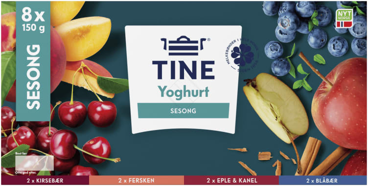 TINE® Yoghurt Sesong Høst/Vinter finner du i butikken fra september og består av smakene kirsebær, fersken, solbær og pære. Pakningen består av 8 beger á 150 g.