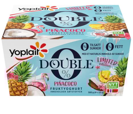 Yoplait DOUBLE 0 er laget på fransk oppskrift og har 0 % tilsatt sukker*, 0 % fett og er en kilde til protein og fiber. Denne yoghurten har en frisk og eksotisk smak av ananas og kokos.